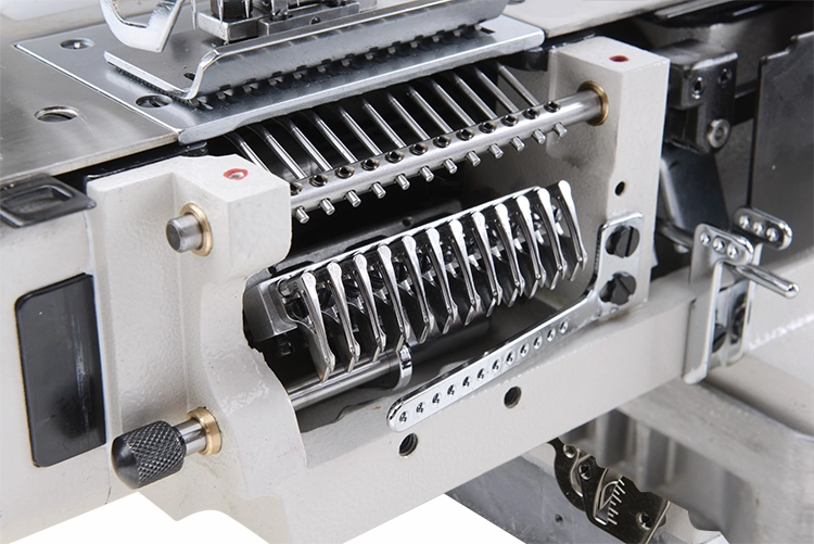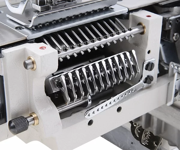 Bộ phận đẩy vải sử dụng trục kim độc lập, có thể tuỳ biến thay đổi vị trí các kim giúp máy có thể sử dụng cho nhiều mục đích khác. Trục kim có thể tháo rời để dễ dàng luồn chỉ.