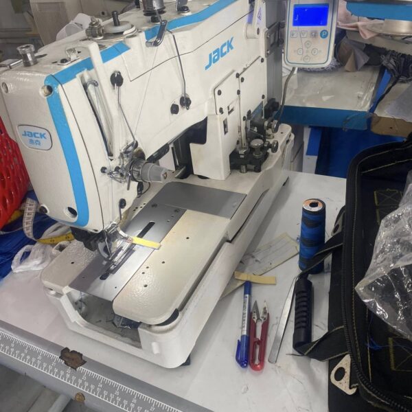 Máy may thùa khuy đầu bằng jack liền trục là dòng máy thùa khuy công nghiệp của thương hiệu Jack có động cơ servo liền trục, hoạt động êm ái, giảm tiếng ồn và rung, tiết kiệm năng lượng, cùng với khả năng tự động cắt chỉ và nâng chân vịt. Các máy này được thiết kế để tăng năng suất và độ chính xác khi thùa khuy cho nhiều loại vải khác nhau, với các tính năng bổ sung như đèn LED chiếu sáng và cài đặt đơn giản.